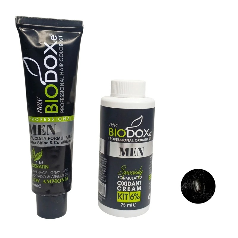 کیت رنگ موی مردانه بیوداکس شامل اکسیدان 6 درصد با حجم 75 میلی لیتر و تیوپ رنگ مو با حجم 150 میلی لیتر به همراه برس رنگ مو و دستکش و کلاه مخصوص رنگ در قالب یه کیت رنگ مو ارائه میشود. کیت رنگ مو بیوداکس شماره FM 10 حجم 150 میلی لیتر رنگ مشکی طبیعی مو حاوی روغن آرگان و کره آووکادو و کراتین هیدرولیز شده و ویتامین C و نرم کننده میباشد و کمترین میزان آمونیاک را دارد.